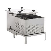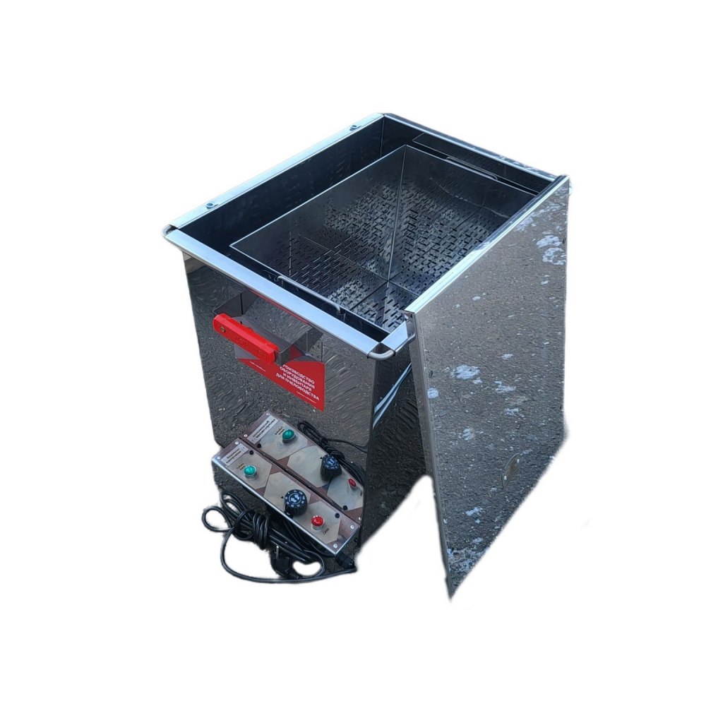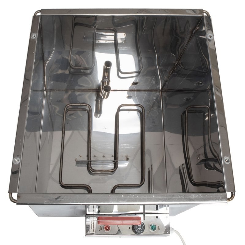 Воскотопка состоит из бака воскотопки, корзины для загрузки рамок, поддона для слива воска, патрубка для слива воска, патрубка для залива воды и крышки. Изготовлена из пищевой нержавеющей стали AISI 201.Толщина металла 0,5 мм.